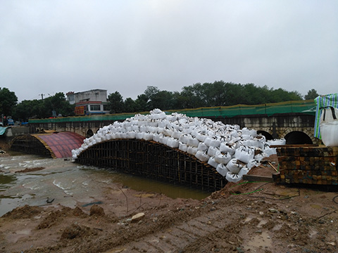 目前,高河大橋正在進(jìn)行主拱圈支架預(yù)壓工作。為了確保主體工程的質(zhì)量及安全,項目部嚴(yán)格按照專家評審方案,認(rèn)真計算相關(guān)參數(shù),精心組織施工,對基礎(chǔ)及支架進(jìn)行超載預(yù)壓,并做好觀測工作,嚴(yán)格要求沉降量符合規(guī)范,保證主拱圈澆筑的質(zhì)量及安全。